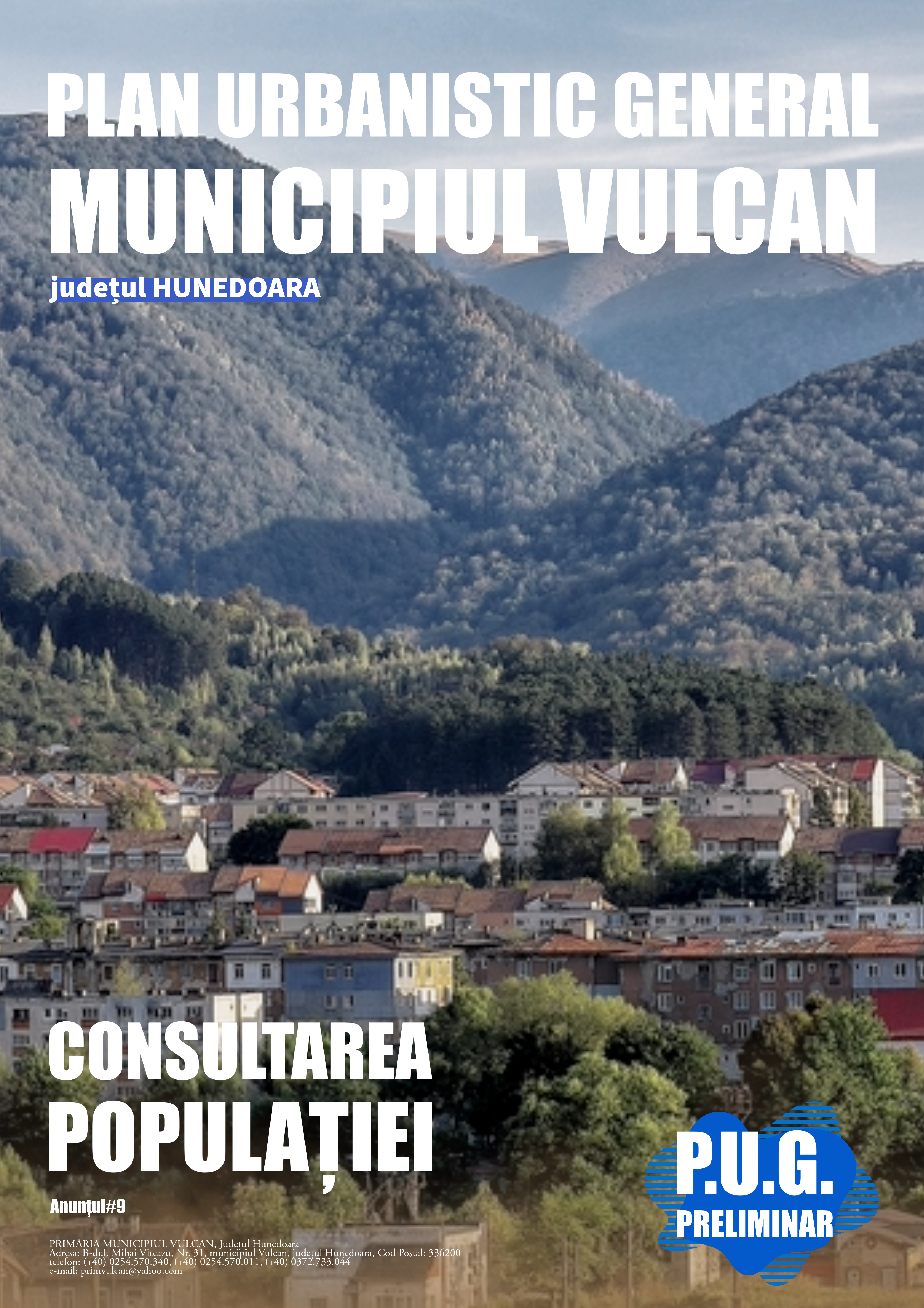 CONSULTARE PUBLICĂ- ELABORAREA/ACTUALIZAREA ÎN FORMAT GIS A DOCUMENTELOR DE AMENAJARE A TERITORIULUI ȘI DE PLANIFICARE URBANA MUN. VULCAN, JUD. HD.