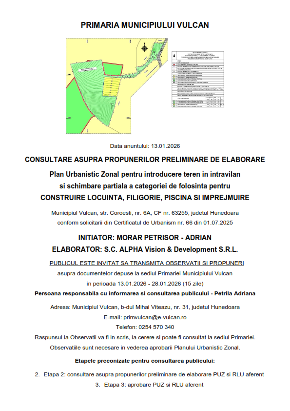 RAPORT DE INFORMARE ȘI CONSULTARE A PUBLICULUI PRIVIND ,, ACTUALIZAREA ÎN FORMAT DIGITAL/ GIS. A PLANULUI URBANISTIC GENERAL (P.U.G.) ȘI A REGULAMENTULUI LOCAL DE URBANISM (R.L.U.) ALE MUNICIPIULUI VULCAN